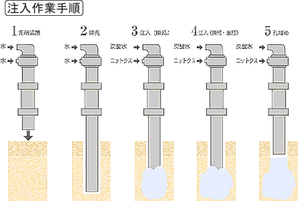 | 主剤に特殊水ガラス(ニトックス)を用いることで、在来の無機系グラウトより強度が高く、かつ安定した物性が得られます。 | ||