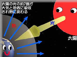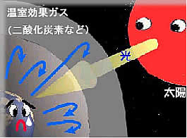| 大気は、太陽からの光線を通過させると同時に宇宙へ逃げようとする熱をとらえて、地球を暖めています。それは、温室のガラスのような働きとよく似ています。温室のガラスは、太陽光線をとおしますが、温室から外へ逃げようとする熱はさえぎります。そこで、大気のこのような働きを温室効果