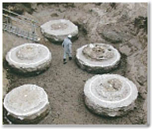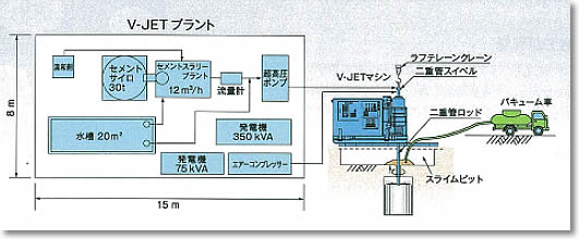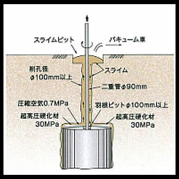 V-JET工法は、セメント系硬化材の大容量超高圧噴射(35MPa、200g/分)にて地盤を切削し、円柱状の改良体を造成する高圧噴射攪拌工法です。 |